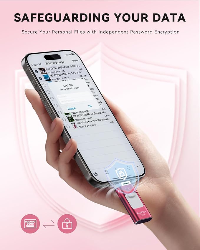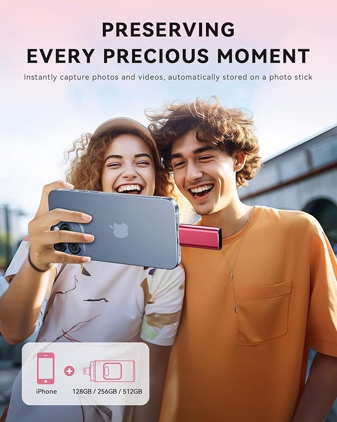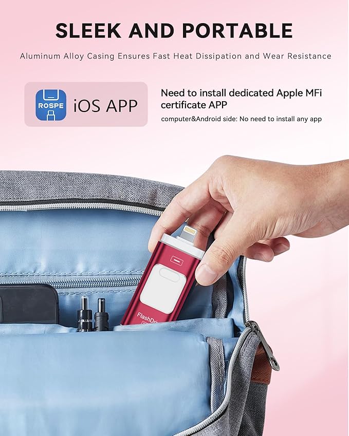 - Compact & Convenient: This MFi-Certified 256GB iphone photo storage stick helps you solve storage issues on your iPhone/iPad/PC, allowing you to easily back up your photos, videos, and phonebook with just one click using the app USB drive. (Note: To use this iphone memory stick on an iPhone/iPad, please download and install the "ROSPE" app from the App Store. For Android phones, simply enable the OTG function, no need to download any additional apps.)