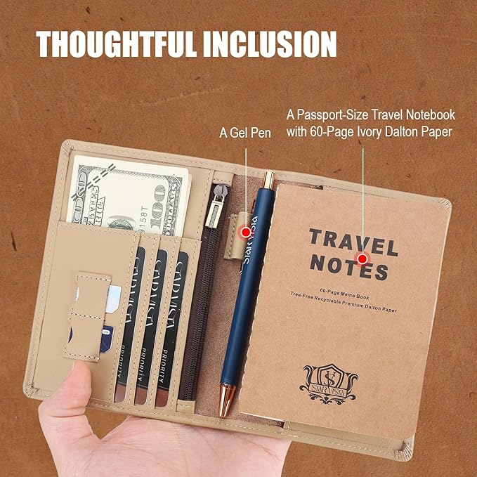 STAR VISTA Phoenix Leather Passport Holder, Calfskin Leather Travel Wallet, RFID Blocking, with ID Window, Zipper Pocket, Card Slots, AirTag Slot, Ivory
