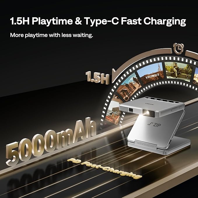 - 1.5-Hour Playtime & PD Fast Charging — With a built-in 5000mAh battery, ZIP travel projrctor delivers up to 1.5 hours of video—ideal for movies, workouts, or stories. Recharge quickly with 24W Type-C PD (adapter required for use while charging)