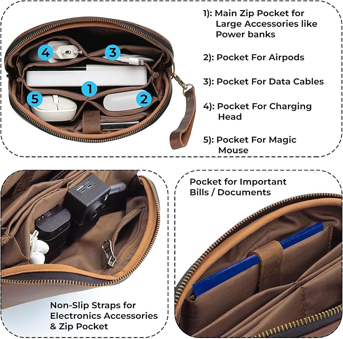 - This leather Electronic Organizer measures 11" x 5.0" x 3" (inches). Itβs a perfect secure storage due to its zipper lock and with inner apartments keep all your gadgets in a well-organized way.