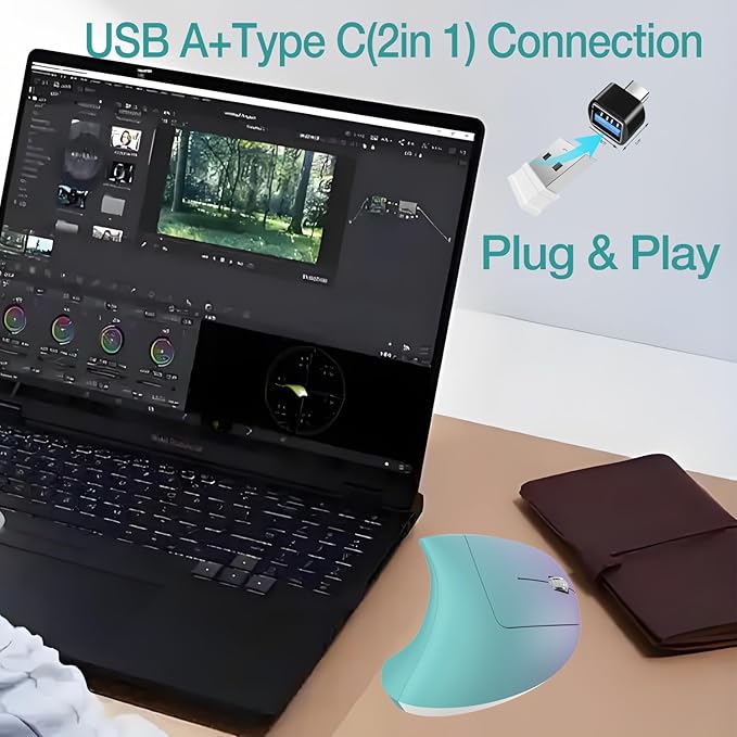 - 【Multiple connection methods】This vertical ergonomic mouse uses connection methods: 2.4GHz USB A+USB C, It is very suitable for devices without USB ports. When using the 2.4GHz USB connection mode, you only need to plug in the USB receiver to quickly connect. It is equipped with both USB A and USB C receivers. When there is only a Type C interface on the device, plug the USB C receiver into the USB A receiver, and then plug it into the Type C interface of the device to use it.