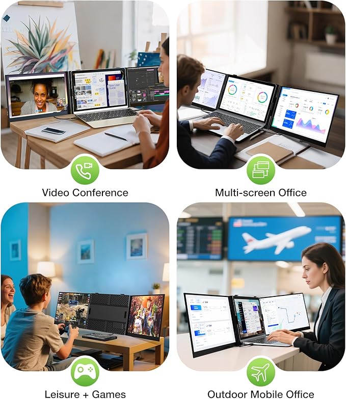 - 【Double Screen Double Efficiency】The laptop monitor extender attached to your laptop can get triple screens for usage. The laptop monitor extender supports extended, mirrored, duplicate, portrait, and landscape modes. It can perform multiple tasks at the same time, greatly improving efficiency (up to 300%), and is a rare productivity tool.The portable laptop monitor is perfectly used by office worker, stock trader, programmer, musician, entrepreneur, engineer, blogger, writer, student,etc.