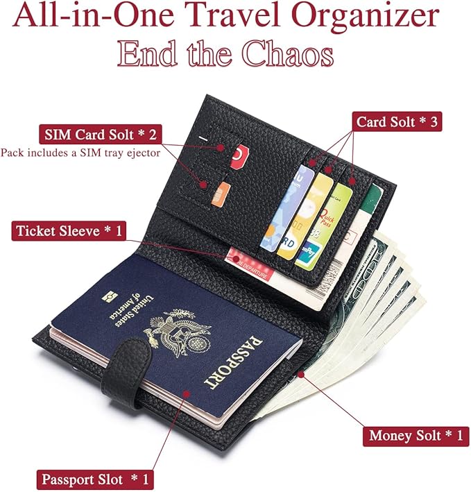 - ✅【All-in-One Travel Organizer】 Designed for modern women on the go, this leather passport holder fits your passport, credit cards, boarding passes, SIM cards, travel documents, and cash. Includes a back zipper pocket for coins and a secure SIM card ejector tool—making it a must-have for international travel.
