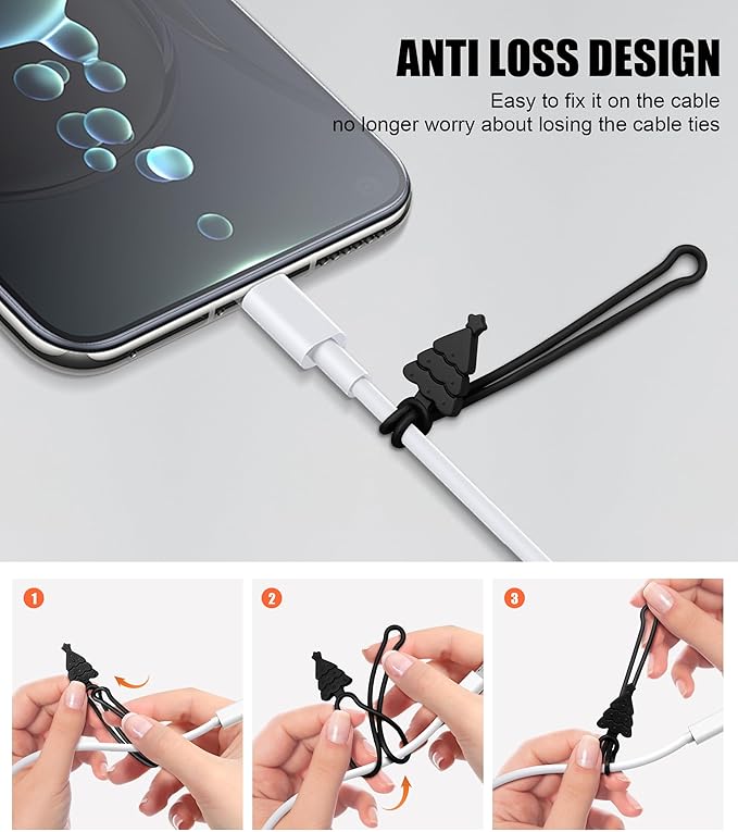 - 【Easy to Use & Anti-Loss】The most convenient design allows you to easily organize like tying a rubber band. Compact and portable, but it still has anti loss function. Simply wrap around the cable and thread the tail end through the middle to easily secure it to the cable, avoiding loss