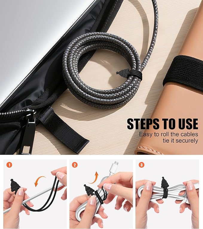 - 【Easy to Use & Anti-Loss】The most convenient design allows you to easily organize like tying a rubber band. Compact and portable, but it still has anti loss function. Simply wrap around the cable and thread the tail end through the middle to easily secure it to the cable, avoiding loss