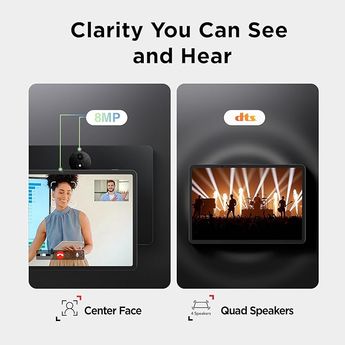 - Vivid Visuals, Immersive Audio: The TCL NXTPAPER 11 Plus tablets feature 8MP front and rear cameras for HD video calls and everyday photos. Featuring CenterFace tracking, you stay perfectly focused even while moving. Quad speakers and dual microphones, boosted by smart PA and DTS audio, deliver deep bass and clear vocals. The Sound Booster function instantly boosts volume from 100% to 200%, enhancing your experience in movies, calls, and entertainment