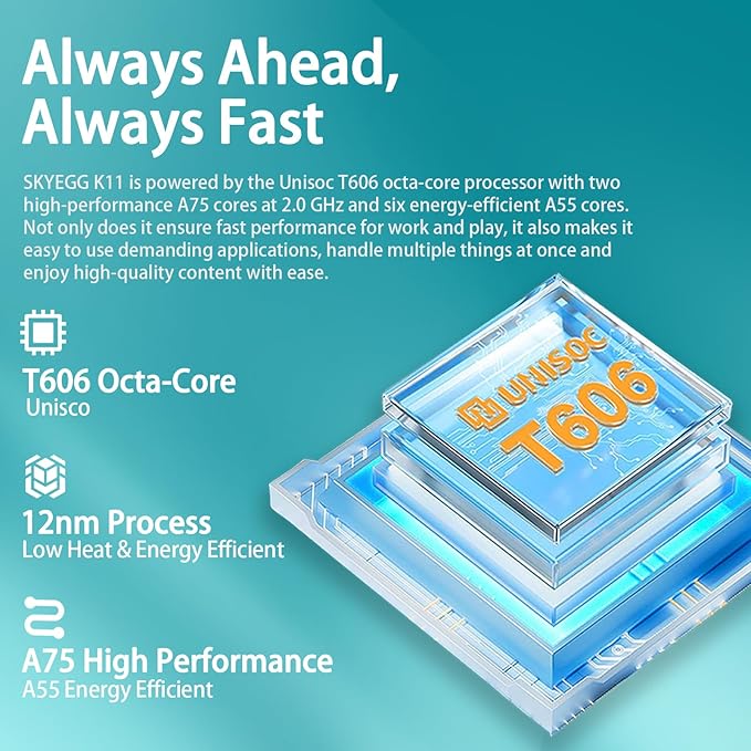 - OCTA-CORE PROCESSOR: SKYEGG K11 is powered by the Unisoc T606 octa-core processor with two A75 cores at 2.0 GHz and six power-efficient A55 cores. It not only ensures fast performance for work and play,but also makes it easy to use demanding applications