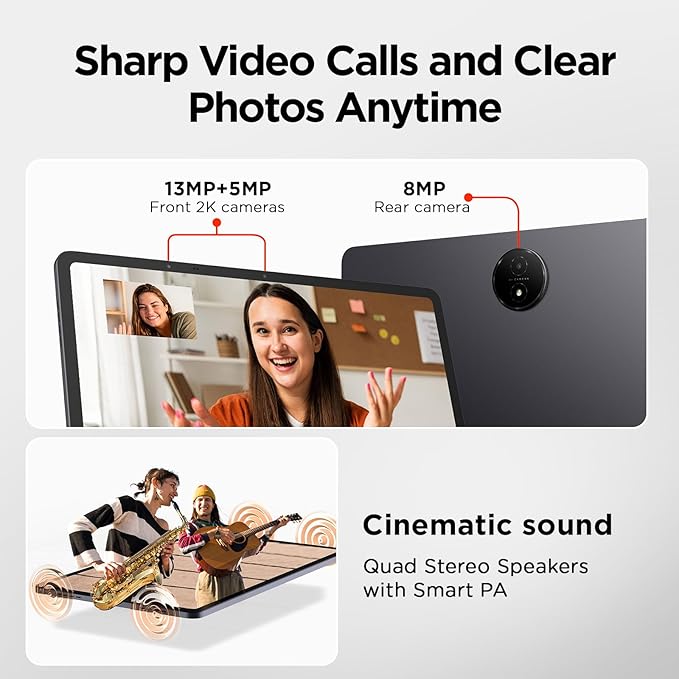 - Immersive Multimedia with Sharp Video & Rich Audio: The TCL NXTPAPER 14 tablets feature dual front cameras (13MP + 5MP) and an 8MP rear autofocus camera, all supporting 2K video for clear, detailed visuals in video calls, online teaching, or vlogging. The quad stereo speaker system with Smart PA delivers rich, room-filling sound — up to 200% volume — for an experience you’ll feel as much as hear