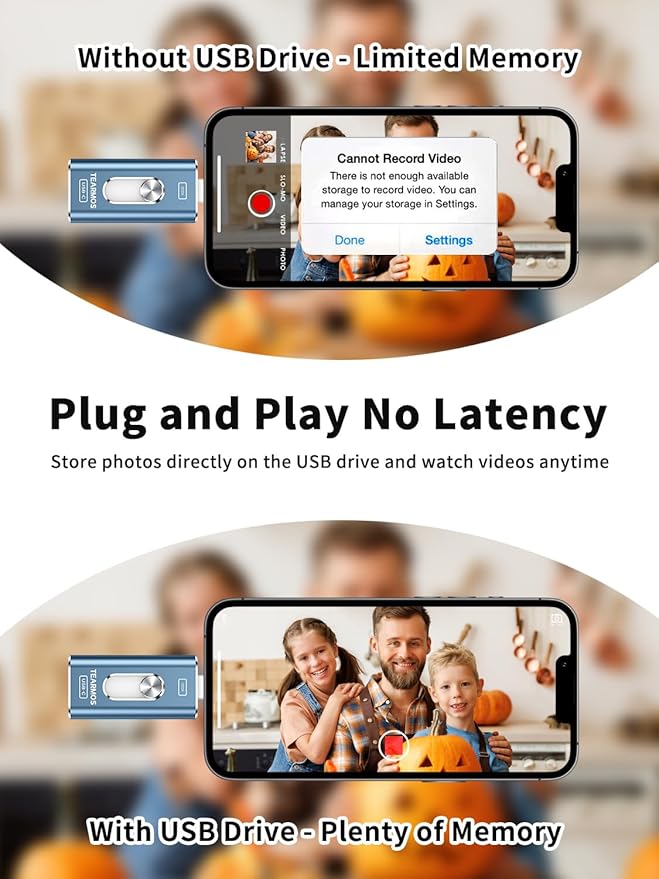 - 【3 in 1 Multi-Port Phone Storage Drive】Our versatile 3 in 1 phone storage flash drive features separate USB-C, USB-L, and USB ports (with an Adapter), streamlining data transfer between devices. Say goodbye to cables, iTunes, and iCloud restrictions. Compatible with iPhone 16/15/14/13 series, iPad Air/Pro, Android smartphones (with OTG enabled), and computers. (Note: Requires iOS 13 or higher for iPhone; Android devices must support OTG)