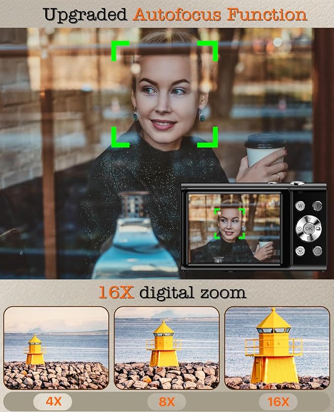 - INNOVATIVE AUTOFOCUS & 16X DIGITAL ZOOM - The upgraded 2025 camera digital now features an advanced innovative function for sharper, clearer images.Simply use the W/T button to control the 16X digital zoom and capture stunning distant landscapes with the small digital camera. To focus, press the shutter button halfway until the frame turns from yellow to green, then press fully to snap perfect photos with ease.