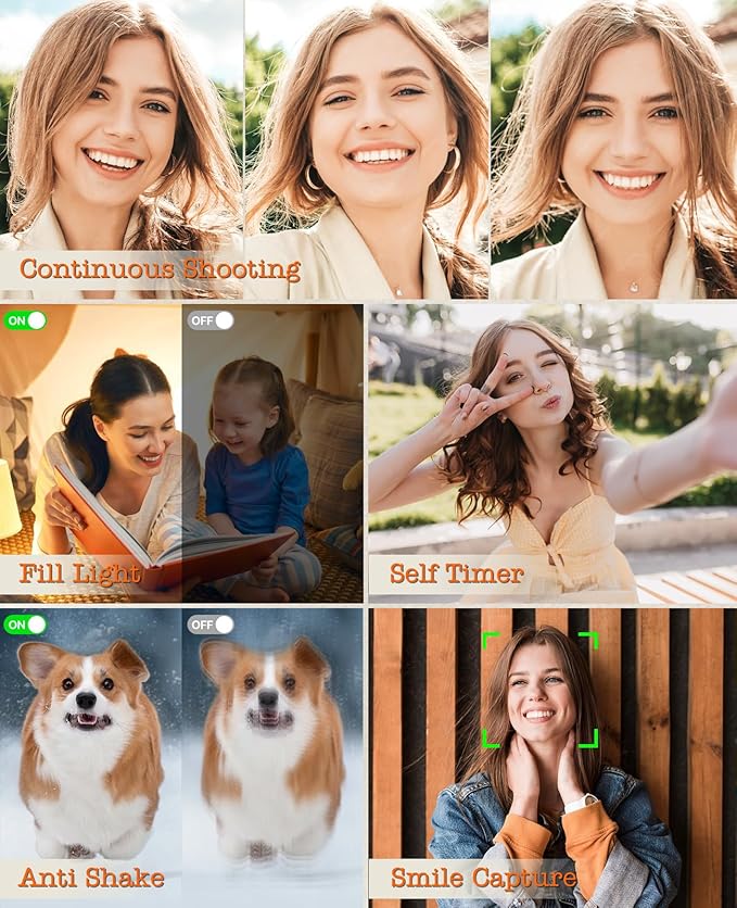 - POCKET-SIZED & POWERFUL FUNCTION -This small compact retro camera is easy fits in your pocket and functional for teenagers and adult beginners.The photo looks retro when taken. Nine shooting modes such as Night, Landscape and Backlight plus multiple optional filters can be used for most shooting scenarios; The beauty function, anti-shake, continuous shooting, detect smiley face auto shooting effect and time-lapse self-timer (2/5/10S) can help you get beautiful portrait photos.