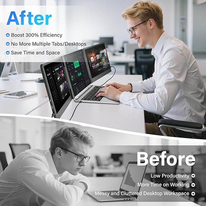 - [Triple screen, Triple efficiency] The portable monitor is the perfect triple screen monitor for laptop, allowing you to open multiple windows simultaneously without switching back and forth continuously on a single laptop screen, improving your efficiency by up to 300%. With this monitor extender for laptop, you can easily build your own working station anywhere. Perfect for gamers, programmers, finance and investment professionals, designers, and anyone who needs more efficient workflows.