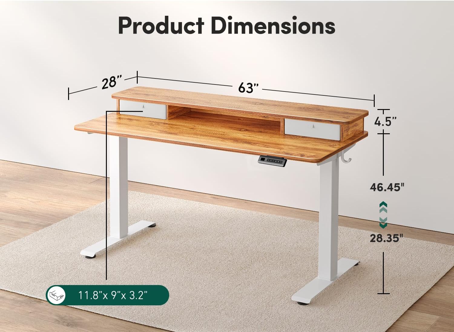 FEZIBO 63 x 28 Inch Deeper Height Adjustable Electric Standing Desk with Double Drawers, Sit Stand Up, Home Office Computer Desk with 4 Height-Adjustable Feets & 2 Hooks, White Frame/Light Rustic Top