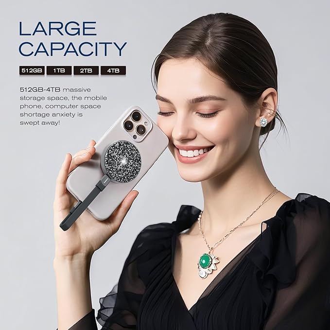 - Shining Elegance, Lasting Durability: The DIGIERA Diamond-Edition SSD combines a luxurious diamond-inspired exterior with a rugged aluminum casing, resisting shocks (1,500 G), vibrations (10–2,000 Hz), and drops up to 3.94 ft. Weighing only 1.58 oz and measuring 2.28 x 0.46 in, this ultra-portable SSD fits easily into your pocket or purse—perfect for professionals who want both style and reliability on the go