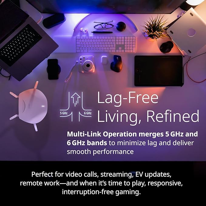- LAG-FREE LIVING, REFINED: Multi-Link Operation merges 5 GHz and 6 GHz bands to minimize lag and deliver smooth performance for video calls, streaming, EV updates, remote work—and when it’s time to play, responsive, interruption-free gaming.