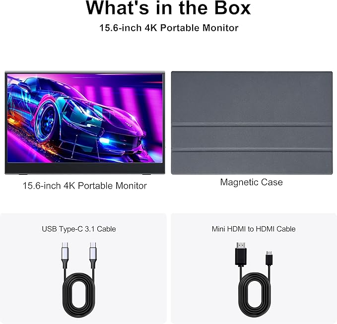 4K Portable Monitor 15.6" 3840×2160P(16:9) Screen 100sRGB IPS Display, with HDMI & USB-C Plug & Play, External Monitor for Laptops/MacBook/PCs/Phones/Xbox/Switch/ PS4/5/NVR