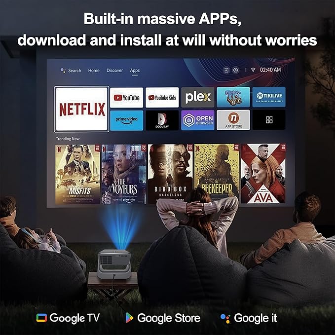 - [Goggle Voice Assistant] The powerful Goggle Voice Assistant can easily realize human-computer interaction. Just press the voice button on the remote control and use the standard language you are familiar with to achieve automatic input and quick query, which greatly facilitates usage and experience. All operation UIs are familiar GTV ecosystems, which greatly facilitate operation and use, and improve the perfect matching of home smart theaters and TV projectors.