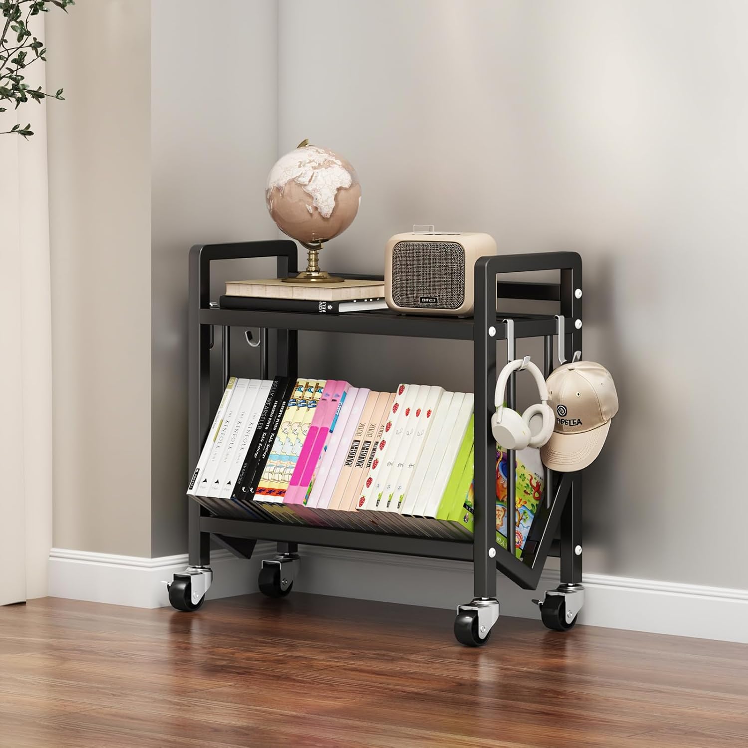 Bookshelf Movable Book Cart Multi-Layer Storage Rack Large-Capacity Rolling Cart L-Shaped Carbon Steel Shelf Suitable for Storing Books, Magazines, Newspapers, Shoes