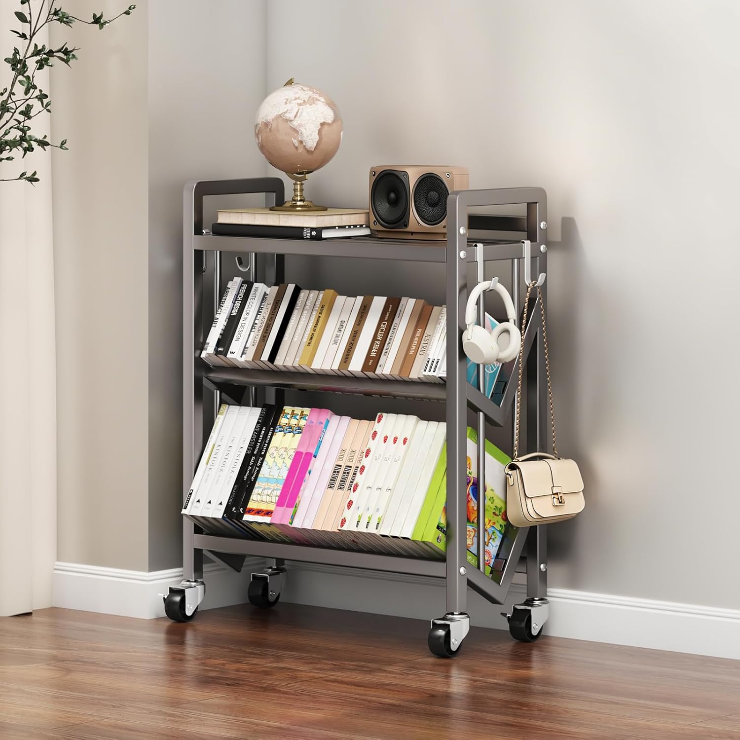 Bookshelf Movable Book Cart Multi-Layer Storage Rack Large-Capacity Rolling Cart L-Shaped Carbon Steel Shelf Suitable for Storing Books, Magazines, Newspapers, Shoes