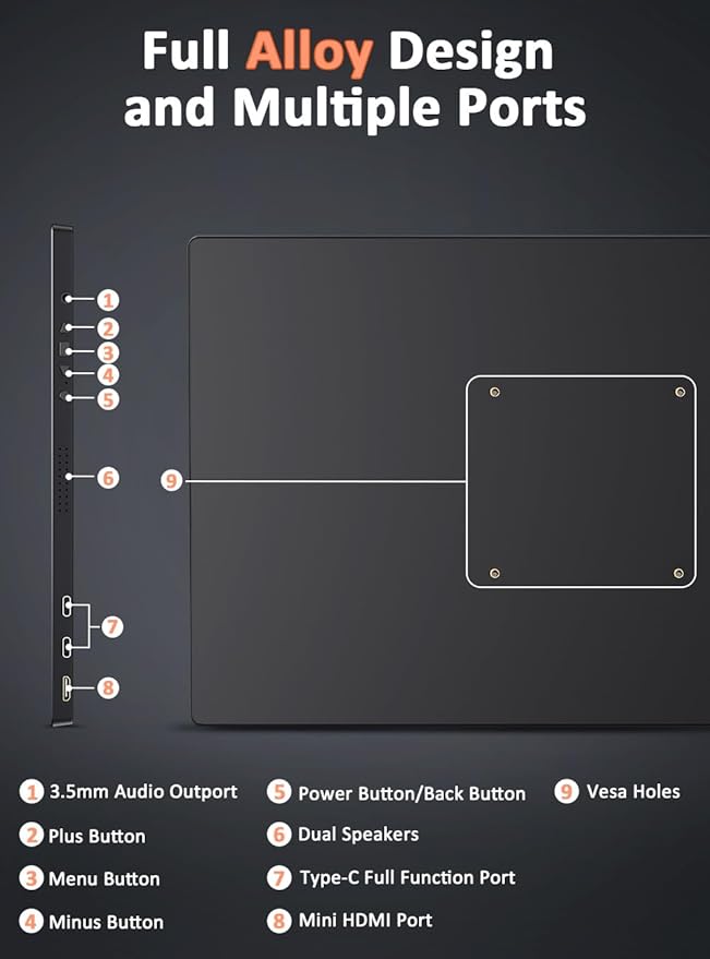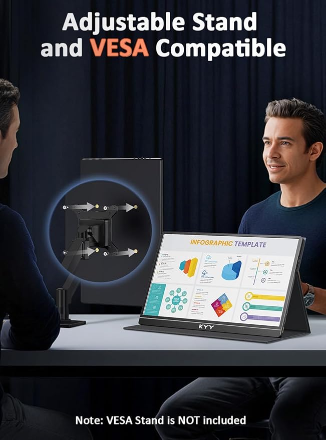 - [ VESA Mountable & Magnetic Cover Monitor]: KYY 4K portable monitor for laptop comes with a premium PU leather magnetic protective case for reliable protection during your travels. Four VESA mounting holes on the 4K monitorβs back allow for easy and secure installation on VESA mounts in both landscape and portrait orientations (VESA mount not included). The VESA mounting dimensions are 75 x 75 mm, and M4 x 3 mm screws are recommended for installation