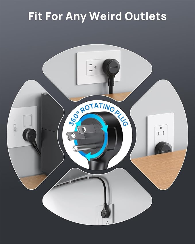 - 360° Rotating Flat Plug: 360° rotating flat plug design can fit any plug and be inserted perfectly at any angle(0.73 in thickness). Handy to use in confined areas. US Utility Patent No. 11901685. Made of 14AWG pure copper, the 10-foot extension cord is heavy-duty and has better current carrying capacity (15a).