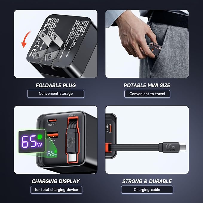 - 【The Perfect Travel Charger for On-The-Go Users】 Your all-in-one charging solution for travel and daily commutes. The integrated retractable charger design means no more tangled wires. The retractable cord design easily fits into any travel bag, making it the ideal companion for your journeys, keeping all your devices powered with superior 65W performance.