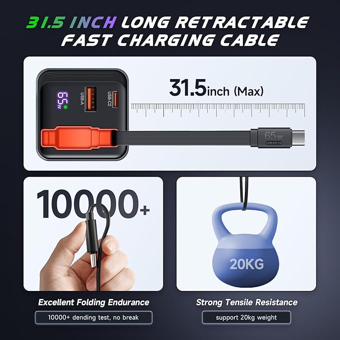 - 【65W High-Speed Retractable Charger with LCD Display】 Experience the ultimate convenience of a built-in 31.5-inch retractable USB C cable, say goodbye to tangled cords – simply extend the cable when you need it and retract it back into the charger for easy storage and portability. This 65W USB C charger block delivers blazing-fast speeds, capable of fully charging a iPhone 17 Pro Max in just 1.5 hours from 0% to 100%. The smart LCD screen visually confirms the real-time charging power, so you're always in the know.