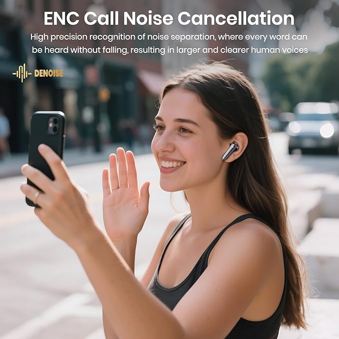 - 【Clear Call Experience】This noise cancelling earbuds uses advanced ENC call noise reduction technology to effectively filter out more than 80% of external noise, ensuring that the other party's voice remains clear during busy commuting, work or exercise, providing you with a high-quality call experience. The Headphones equipped with 2 high-performance microphones, it can accurately capture your voice, so that the other party can always hear clearly throughout the call even in a noisy environment.