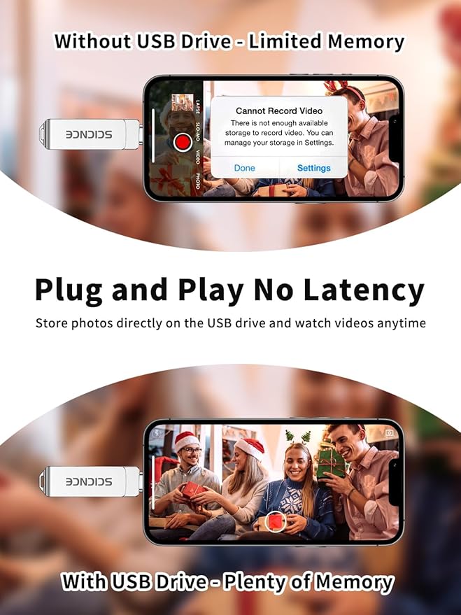 - 【Watch Movies, Photos and Play Music Directly From Phone Flash Drive】Store your favorite videos, audios and music on your iPhone's Photo Stick, then seamlessly plug and play on your iPhone or iPad anytime, anywhere. No more need for Internet or WiFi. This iPhone storage device plays videos in many different formats. Pictures stored on the Phone storage device also support different formats. Great way to store all your pictures and videos on an phone external storage device.