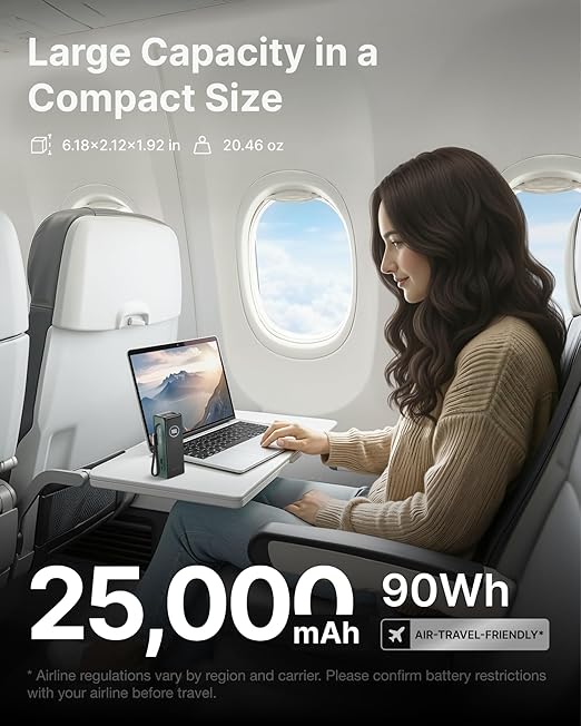 - 25,000mAh Capacity, Air-Travel-Friendly: Provides ample power support for your laptops, meeting remote work needs for 1-2 days. Can charge your phone 4-5 times, eliminating battery anxiety.