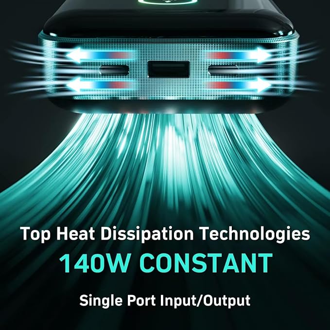 - 4-in-1 250 Total Output: Featuring two USB-C ports, one USB-A port, and one magnetic wireless charging pad, the power bank delivers up to 250W powered by PD 3.1 technology. Boost your MacBook Air (M2) to 50% in just 28 minutes. With top heat dissipation technology, it maintains a constant 140W single-port output without overheating.