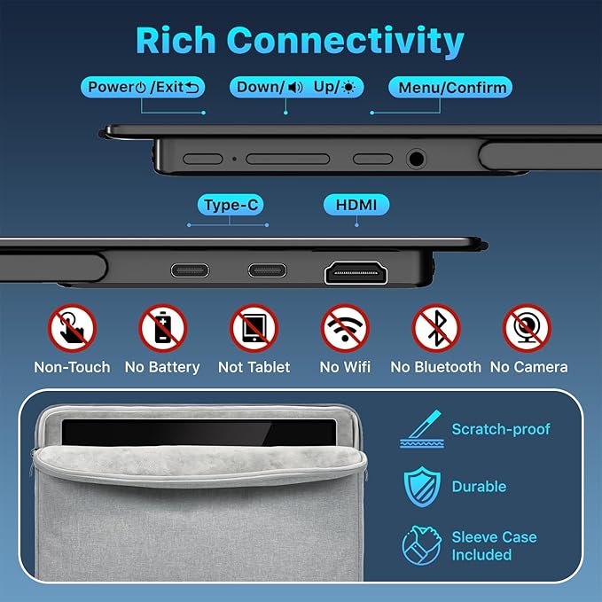 - Ultra-Slim & Lightweight, Sleeve Case Included: Crafted from premium aluminum, this 14" external display weighs just 1.33 lb and measures only 0.13 inches thick at its slimmest point, slipping easily into your backpack and packed with a protective sleeve case in the box. With the built-in dual speakers, it's your perfect travel/work companion: boost productivity or enjoy entertainment anytime, anywhere without extra bulk. Ideal for business trips, remote work on-the-go, or travel adventures—stay productive and entertained wherever you are