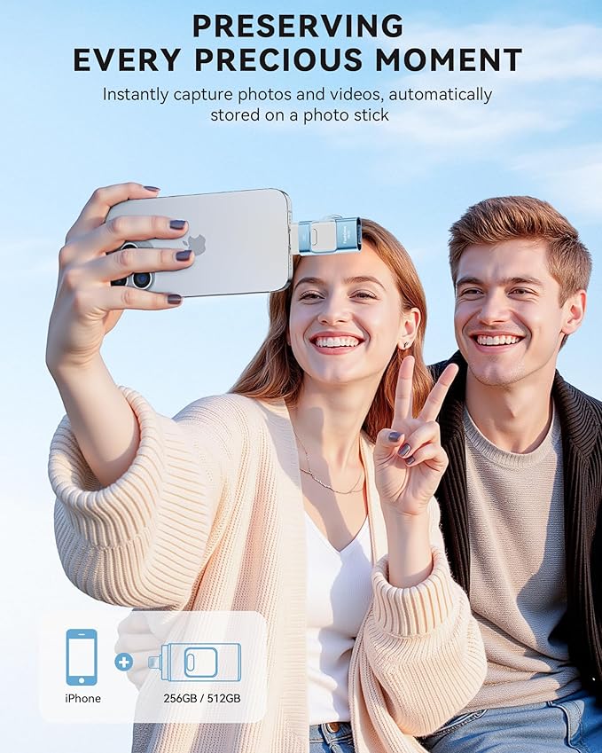 - Blazing-Fast Transfers Anywhere : Equipped with upgraded high-speed chips, this iphone storage flash drive lets you transfer massive files in seconds—no WiFi, no data cables needed. Save time when sharing photos or moving large video projects, whether you’re traveling, working, or creating content.