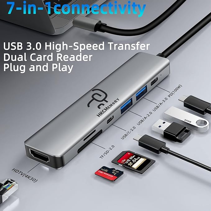 - 【7-in-1 Versatile Expansion】 Transforms a single USB-C port into 7 essential interfaces: 4K@30Hz HDMI, 100W PD fast charging, USB-A 3.0 (5Gbps), USB-A 2.0 (480Mbps), USB-C 2.0 (480Mbps), and SD/TF card slots. Ideal for office work, travel, or multitasking—this compact hub meets all your connectivity needs for enhanced productivity.