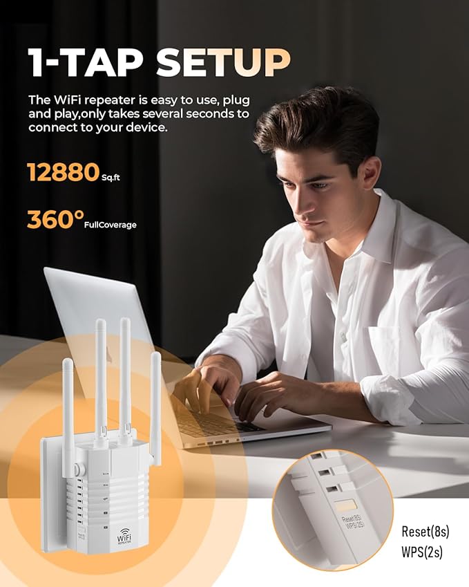 - 4 High - Gain Antennas & Wide Coverage: Four powerful antennas extend WiFi up to 12,880 sq.ft, eliminating dead zones and providing stable signals through walls and floors.