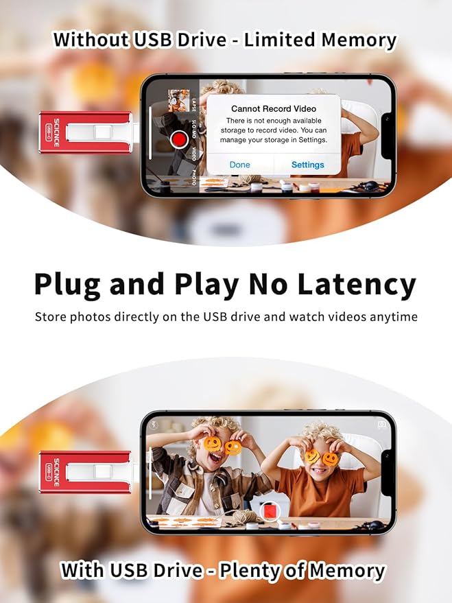 - 【Watch Movies, Photos and Play Music Directly From Phone Flash Drive】Store your favorite videos, audios and music on your iPhone's Photo Stick, then seamlessly plug and play on your iPhone or iPad anytime, anywhere. No more need for Internet or WiFi. This iPhone storage device plays videos in many different formats. Pictures stored on the Phone storage device also support different formats. Great way to store all your pictures and videos on an phone external storage device.