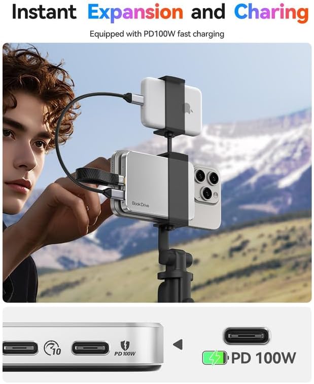 - Instant expansion with PD 100W: Charge your laptop, phone, or tablet at full speed (up to 100W) through the Portable SSD's USB-C port while accessing your files.