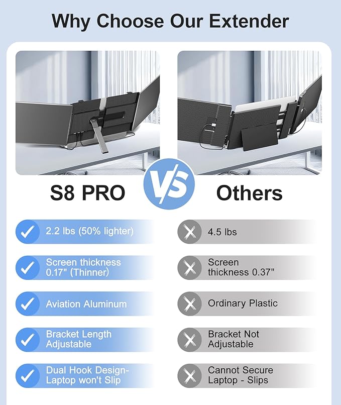 - 【Upgraded Safety Design】This upgraded 14-inch ultralight laptop monitor extender is crafted from aircraft-grade aluminum, making it 50% lighter yet more robust. The portable monitor features silicone gaskets for drop and crush protection. Features a 180° rotatable screen and adjustable aluminum stand for maximum stability and comfort. Perfect for travel and remote work.