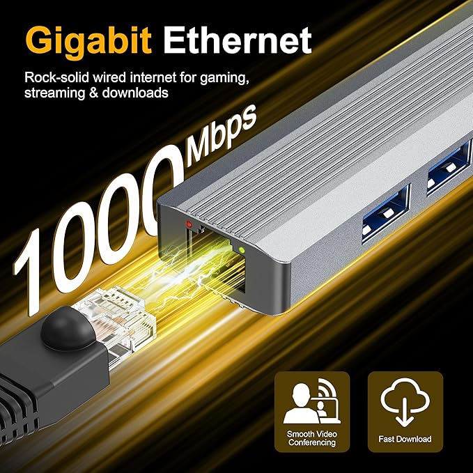 - 【Gigabit Ethernet for Wired Stability & Speed】Equipped with a 10/100/1000 Mbps RJ45 LAN port, this USB C hub provides a rock-solid and reliable internet connection. Ideal for lag-free online gaming, uninterrupted video conferences, and for handling fast, stable large file downloads