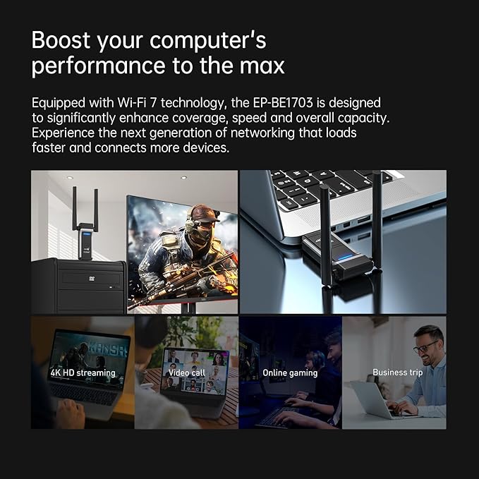 - 【Powerful Signal Coverage】: EDUP BE6500M WiFi Adapter features dual antennas that provide robust signal enhancement, extending the range and stability of your wireless connection for a more reliable and uninterrupted experience. Whether you're participating in real-time meetings, streaming your favorite shows, or playing games, you can enjoy seamless connectivity without any interference.
