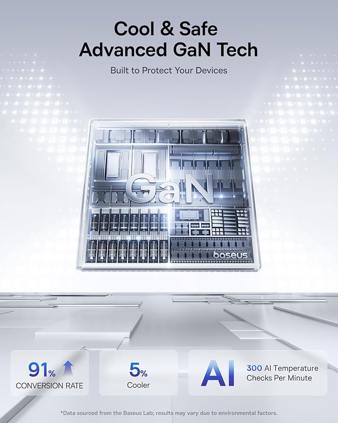 - Effective Temperature Drop: Designed with advanced GaN technology for higher efficiency and lower heat, and AI-powered Baseus Cooling technology (BCT) temperature monitoring 2000 times per second for reliable device protection.