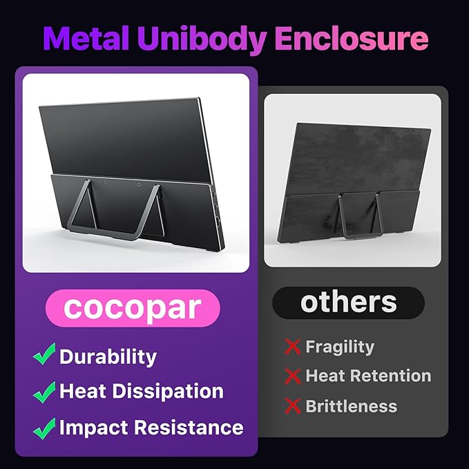 - USB-C Plug-and-Play & Dual Speakers: Cocopar external monitor features two USB-C ports and one HDMI port for fast, flexible connectivity with laptops, PCs, and gaming consoles. Enjoy instant plug-and-play setup and clear audio from the dual built-in speakers, ideal for meetings, streaming, and on-the-go entertainment. (Note: Your deviceβs USB-C port must support Thunderbolt 3/4/5 or DP Alt Mode for plug-and-play.)