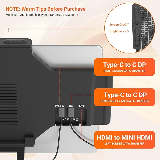 - Reliable Service Support- Rest assured with a 1-year support on our laptop screen extender. If you notice missing accessories or have inquiries about connectivity, feel free to contact us, and we are here to provide a prompt solution within 24 hours. Note 1: The laptops need to support USB-C DP and HDMI port. Note 2: If one screen displays "No Signal," it means the laptop output power is insufficient, requiring extra power for that screen. Note 3: When using an HDMI cable, make sure to connect the dual USB-C port cable to the portable monitor and the DC charger.