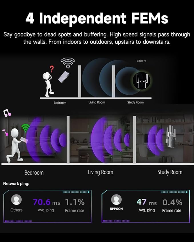 - Supports Over 65 Devices: The Uppoon internet booster offers Repeater, Bridge, and Access Point modes, ensuring compatibility with a wide range of devices, including smartphones, laptops, IP cameras, Alexa devices, Ring, Roku, Fire Stick, and more. Enjoy seamless connectivity with multiple devices online simultaneouslyโno lag!