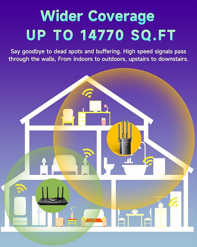 - Full Signal Coverage up to 14770 Sq.Ft: The best WiFi extender signal booster designed to expand your router's WiFi coverage and eliminate frustrating dead zones, buffering, and dropped video calls. With this device, you can maintain a stable WiFi connection anywhere in the house, including the yard, bedroom, basement, and garage