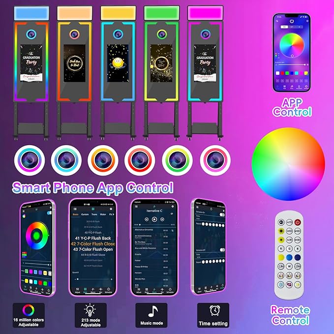 - ๐ก RGB Mirror Photo Booth Turn any gathering into a spectacle with our high-tech RGB lighting. With over 18 dynamic effects and 10 brightness levels, our RGB light strips and fill lights sync seamlessly with your music. You can tune the vibe from a mobile app or remote control, crafting a perfect ambiance for photos, videos, or live streaming.