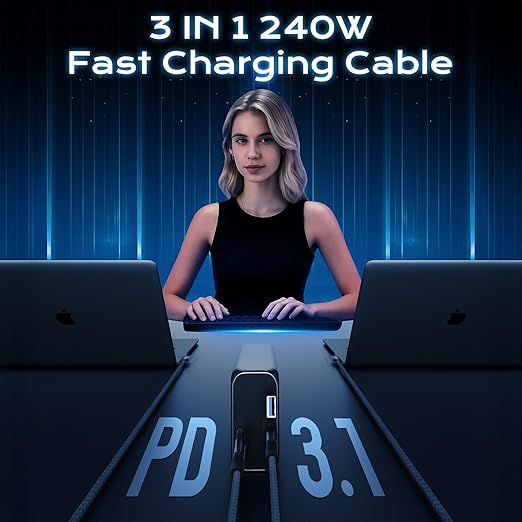 - One Cable is All: USB C to USB C(PD Max 240W)and USB A (QC3.1A) to C charger 2 in 1. Which means you have two USB C cables at the same time, USB A to USB C and USB C to USB C cable. (NOTE: When charging MacBook/air devices, please use the USB C to USB C Cable)