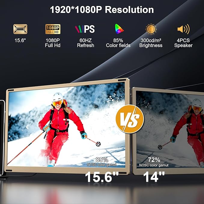 - 【Ultra-Slim 1080P High-Quality Screen】This laptop screen extender features 0.15-inch ultra slim and dual 15.6" FHD 1080P IPS displays. Portable monitor supports 1920x1080P FHD resolution at 60Hz, 178° viewing angle, 85% NTSC color gamut, 300cd/㎡ brightness and 1:1200 contrast. The 16:9 display ratio ensures clear and vibrant visuals.