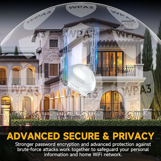 - Commercial-Grade Security Anywhere—IEEE 802.11 B/G/N-compliant WiFi extender protects personal/business use. It features 2025-upgraded WPA3 (supports WPA3/WPA2) for strong encryption, fending off unauthorized intrusions to PCs, phones, security cameras. It builds a reliable barrier, keeping your network and devices safe from cyber risks—fit for daily tasks or sensitive business data.
